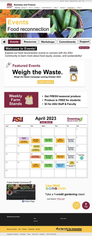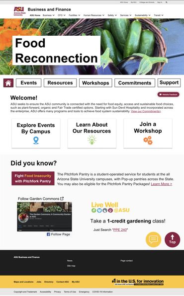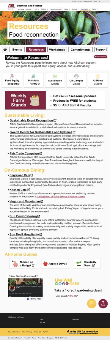 The ASU Food Reconnections page provides a variety of links and resources for the ASU community to connect with, including food equity, accessibility, and sustainability; however, after a preliminary user evaluation, it was found that the Food Reconnections page would benefit from improvements related to content organization, visual web elements, and accessibility tools. Explore below to see the wireframes and mockups addressing the pain points or view my research plan for more information.
